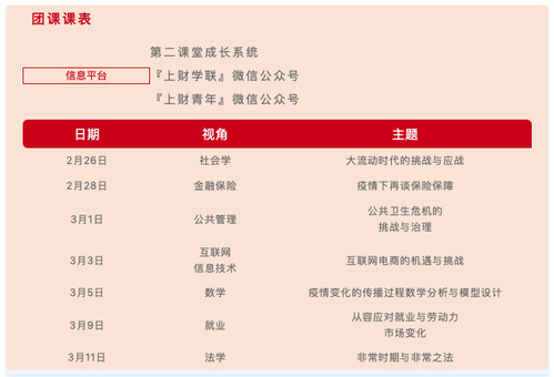 为引领上财团员青年,及时了解疫情进展,从专业角度思考疫情对国计民生的影响,校团委立足共青团“三会两制一课”制度,推出了战“疫”云团课系列直播讲座,使全校团员青年在家中学团课、涨知识,真正实现“停课不停学,开学不延期”。本次系列团课邀请到了上财7位专业实力与人气兼备的“金课”老师,走入直播间,运用专业知识和社会阅历提供“新冠肺炎”疫情下的专业观察和解读。