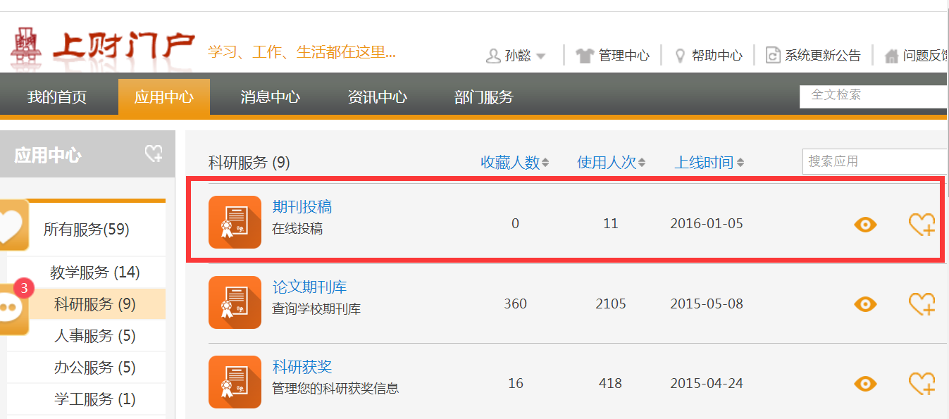 图2 方式二:通过门户网站“应用中心-科研服务”进入“期刊投稿”