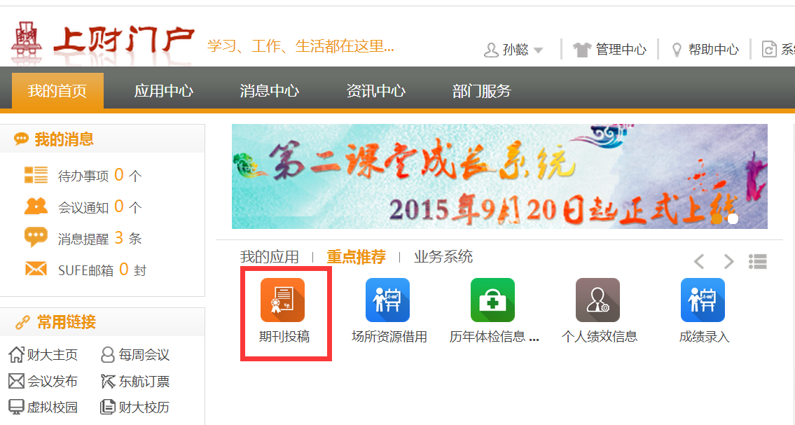 我校用户可以两种方式在上财门户网站一键登录我校三刊“期刊投稿”应用。方式一:通过“重点推荐”栏目进入;方式二:通过“应用中心-科研服务”进入。