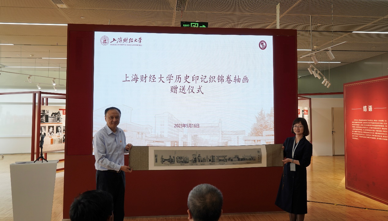 许书记回顾了百年校史,表示上海财经大学是上海社会科学界的一支重要力量。1958年9月,由上海财经学院、华东政法学院、复旦大学法律系和中科院上海经济研究所4个单位合并组建上海社会科学院,这是我校106年校史中的一段特殊记忆,也是我校与上海社科界的一段特殊渊源。随后,许涛书记向上海社会科学馆赠送上海财经大学历史印记织锦卷轴画。