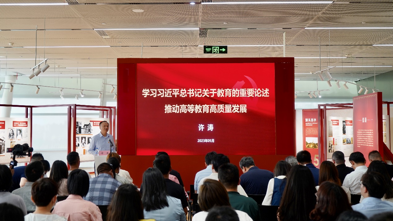 接下来,许涛书记以《学习习近平总书记关于教育的重要论述 推动高等教育高质量发展》这一主题为参加活动的全体师生上了一堂专题党课。许涛书记首先梳理了习近平总书记关于教育重要论述的主要观点,强调要“坚持扎根中国大地办教育”,将世界高等教育前沿思想和方法与中国具体国情和发展现状相结合,更好地为办好人民满意的教育服务。许涛书记特别分享了自己从事教育国际合作与交流工作的工作体会。在谈到脱贫攻坚伟大历程时,他对乡村教师在脱贫攻坚和乡村振兴中的重要作用表示敬意,结合党的二十大报告解读了中国教育的发展成就、发展要求和发展目标。其次,许涛书记阐述了当前世界高等教育的发展趋势,全球教育正在向追求“公平、卓越和国际化”的方向转变。通过介绍美国、英国、俄罗斯、日本等国的教育政策说明借鉴国际经验、坚持对外开放的重要性,指出在信息化时代下青年教师要强化信息素养、与时俱进转变教育观念。最后,许涛书记阐述了大力推动教师队伍建设的内容概要、核心要义和实践成就,教育是一个高尚的职业,他勉励在座教师和有志于从事教育事业的在场学生,要传承“人民教育家”于漪老师“爱的教育”的理念和情怀,争做“四有”好老师。