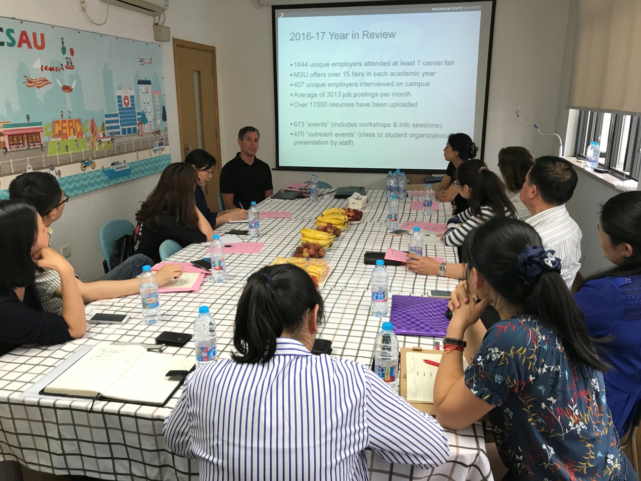 6月10日至6月18日,密歇根州立大学职业发展中心副主任Eric Doerr率该校职业服务代表团访问上海财经大学学生就业指导中心。访问期间,该代表团与我校领导、相关职能部门负责人、院所分管副书记及学工教师、兄弟院校同行、用人单位等开展了交流研讨、合作洽谈及走访调研等活动。