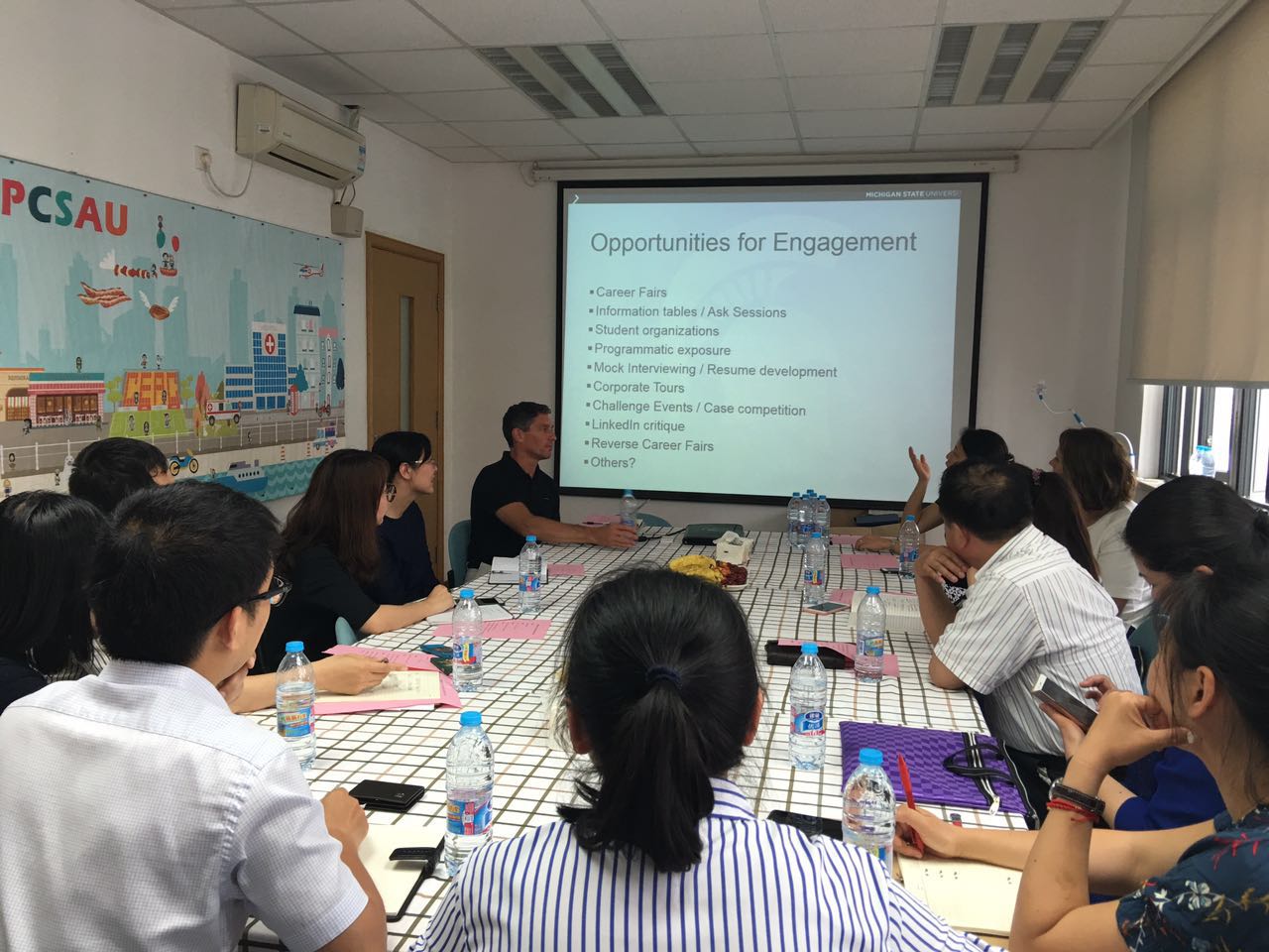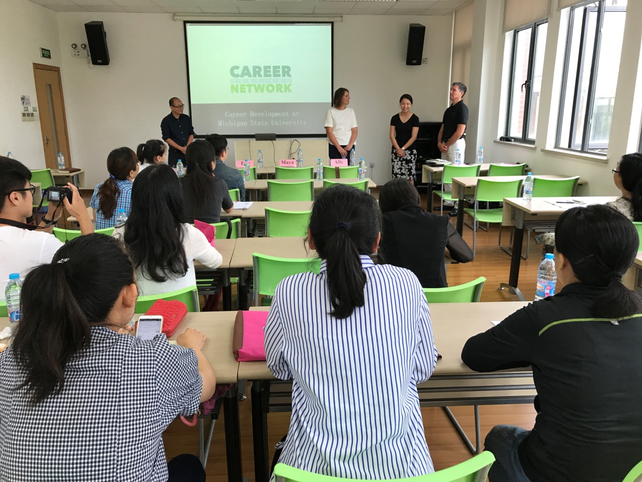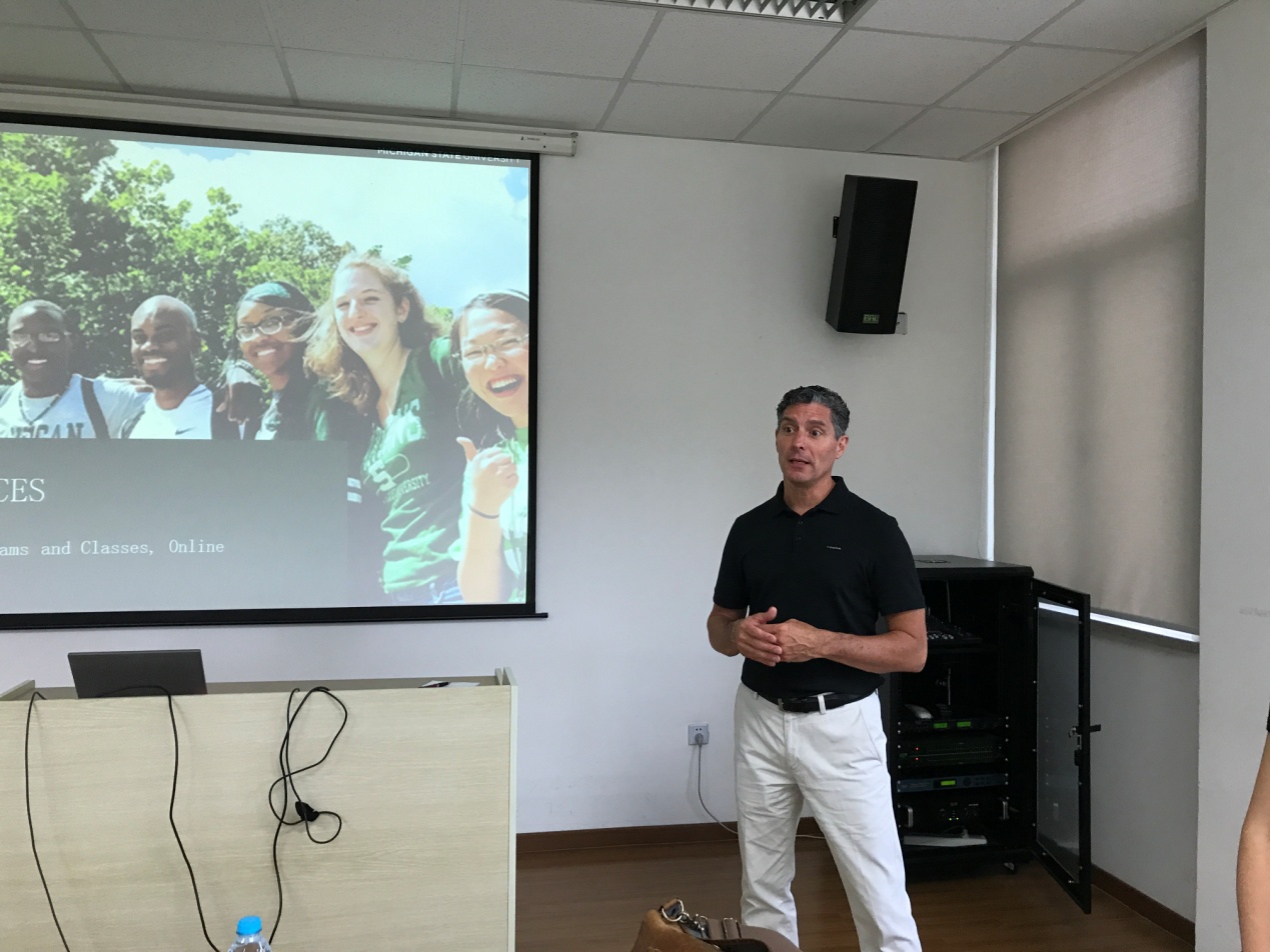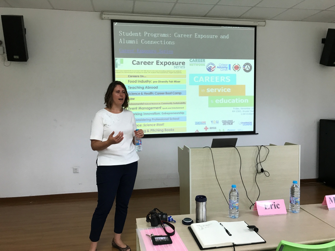 随后,Doerr先生详细介绍了密歇根州立大学的人才培养理念和方式。该校致力于培养“T型人才”,不仅培养学生在专业知识学习上的深度,也注重学生在其他各方面发展的广度。学生的职业发展教育贯穿整个大学生涯,一年级的同学通过参加学校的社团和校园工作来探索学校资源和自我兴趣;二三年级则重在准备简历、参加实习,接受求职方面的指导,为毕业后的发展找准方向。四年级的同学会更多地与雇主和社会接触,找到一份满意的工作,或是继续深造。
