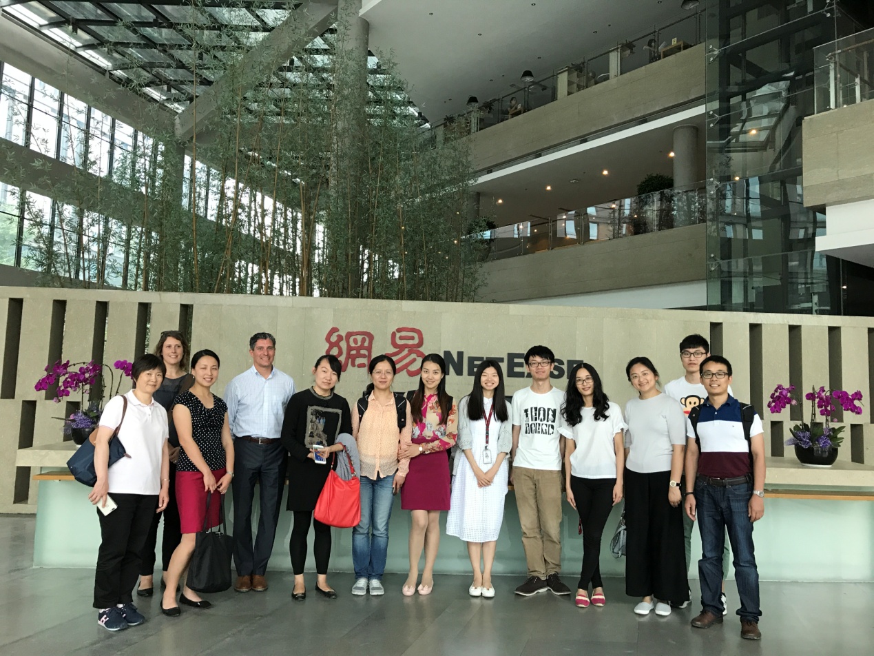 随后,校友徐晓然分享了个人独特的求职经历和在网易工作的心得体会,并表示感谢学校能来公司看望校友,期待学校能输送更多的学生来网易工作。最后,调研团一行参观了网易杭州的园区。