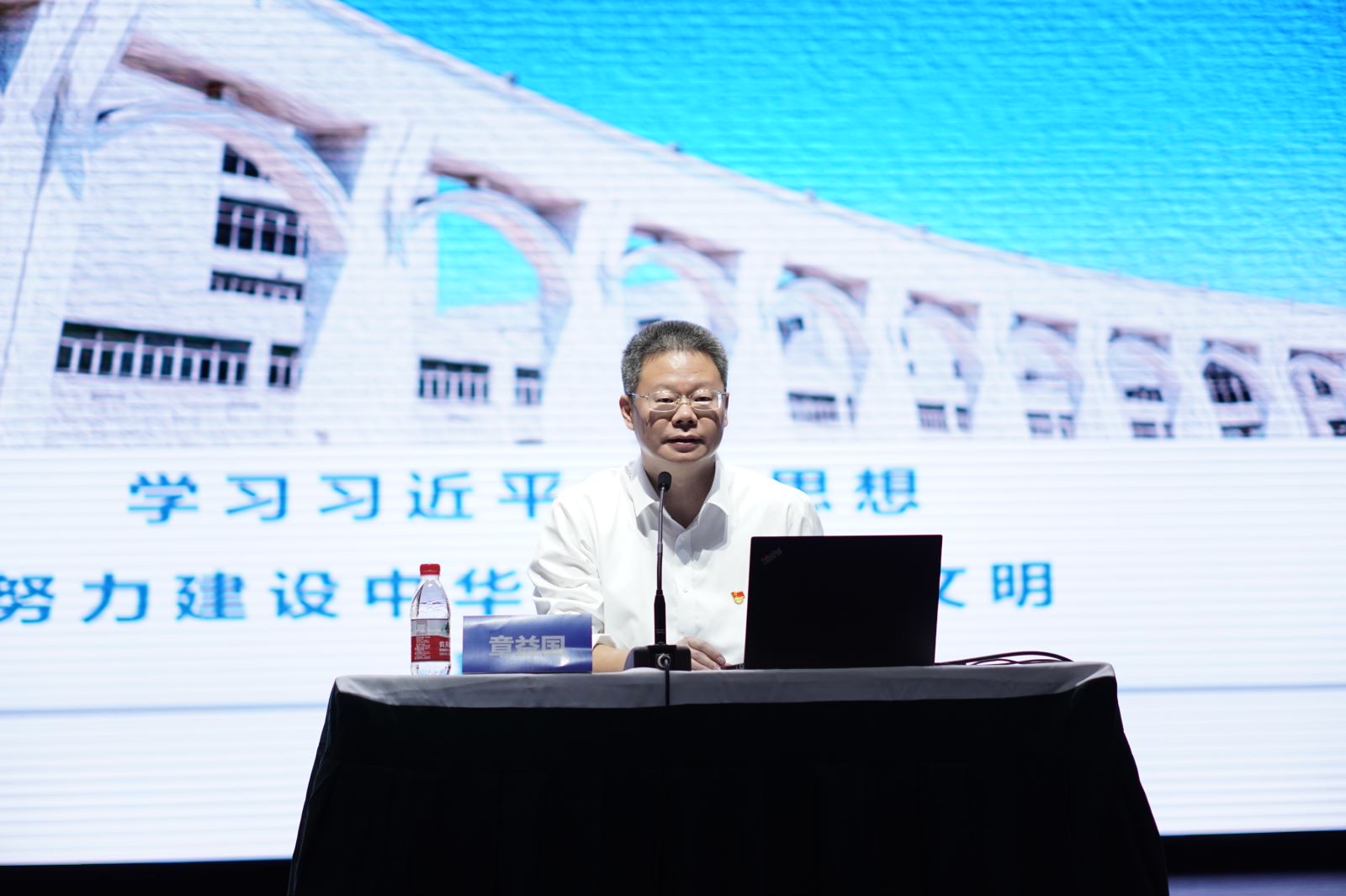 上海对外经贸大学党委副书记、纪委书记章益国教授主讲的题目是“学习习近平文化思想,努力建设中华民族现代文明”。党的十八大以来,以习近平同志为核心的党中央高度重视文化建设,围绕建设什么样的社会主义文化强国、怎样建设社会主义文化强国这一重大时代课题,提出一系列新思想新观点新论断,形成了习近平文化思想。章益国表示,习近平文化思想明体达用、体用贯通,是中国共产党百年来探索马克思主义与中华优秀传统文化相结合丰富经验基础上的理论升华,为做好新时代新征程宣传思想文化工作、担负起新的文化使命提供了强大思想武器和科学行动指南。建设中华民族现代文明应牢牢把握中华文明的五个突出特性,即连续性、创新性、统一性、包容性、和平性。要结合学校历史传统和学科文化,将习近平文化思想融入教学育人全过程。希望大家更好地传承中华优秀传统文化,为建设中华民族现代文明贡献青春力量。