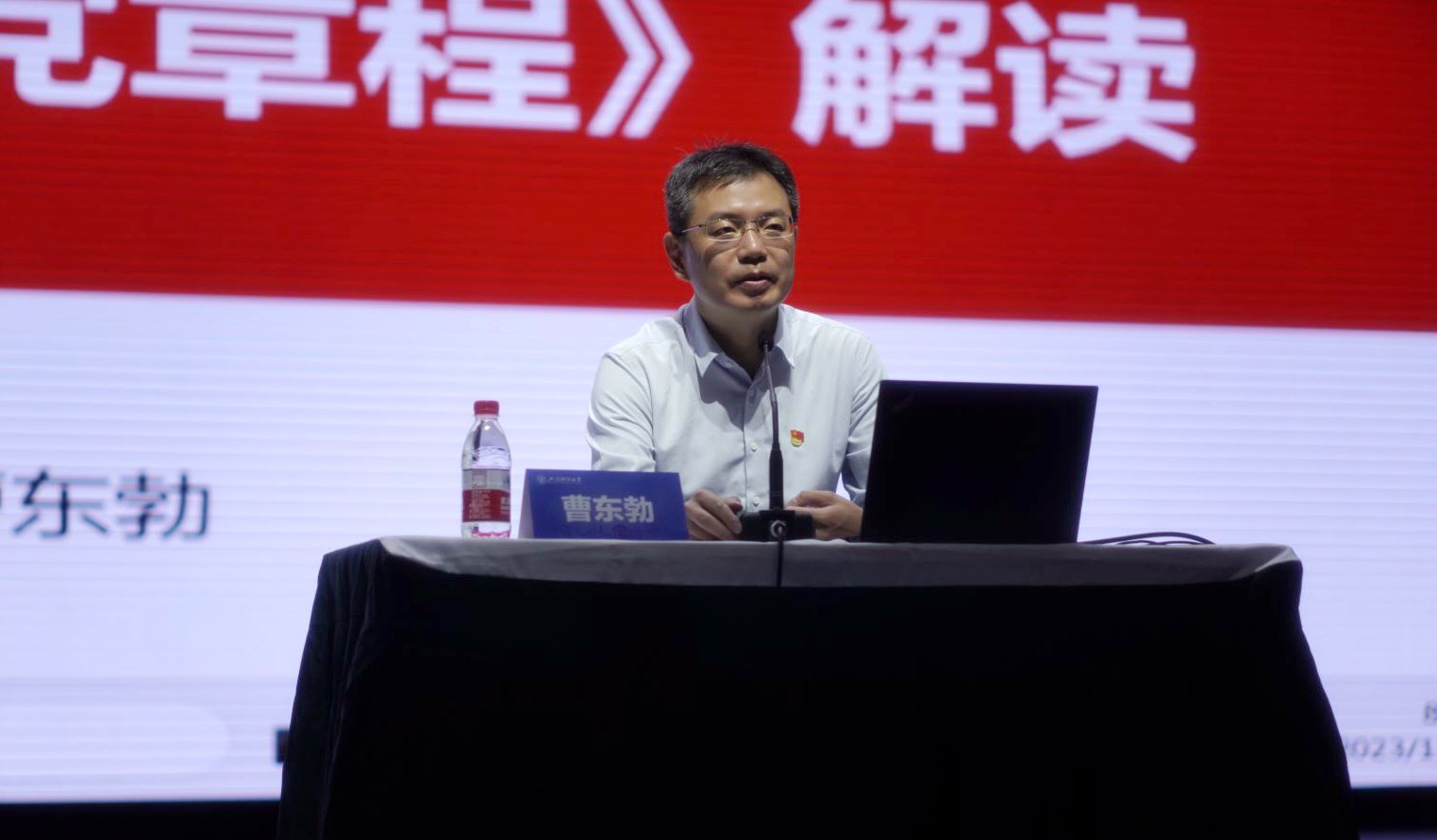 马克思主义学院党委书记曹东勃教授解读《中国共产党章程》。他从“什么是党章”“党的纲领”“党的章程”三方面进行了全面、深入、系统地阐述。曹东勃强调,党章是党的总章程、总规范和根本大法,是引领方向、凝聚力量、树立形象、号召群众的一面旗帜,是治党理政的总依据,是全党同志必须共同遵守的根本性规范。学习党章既要从党章的历史沿革中读懂党的历史及其成就和飞跃,更要对标党章做表率,坚持实事求是,践行群众路线,把党章各项规定落实到行动上。通过学习,进一步提升了学员学习党章、遵守党章、贯彻党章、维护党章的思想自觉、政治自觉和行动自觉。