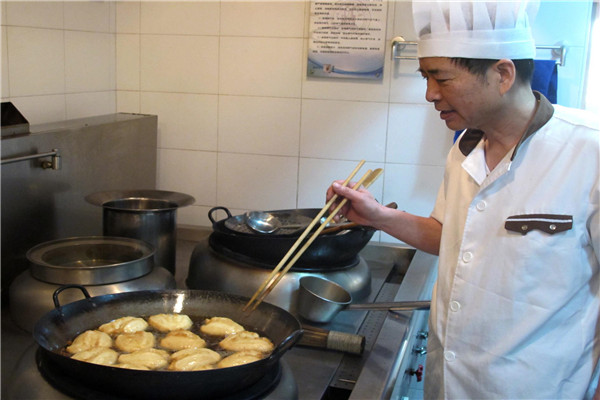 4点40分,点火烧水,开油锅煎炸麻球、南瓜饼、蒸玉米棒。之后,庄佩龙与做早班的小朱师傅一起完成了梅干菜饼、蛋饼等制作。