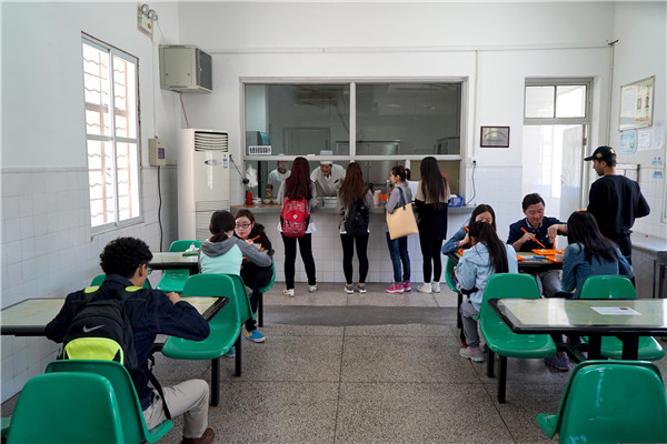 11点整,开始供应午餐。庄佩龙一起参与柜台服务,只要有学生来用餐,他们都会以“你好”、“请问……”开始,并主动介绍提问:“有豆腐汤,你要吗?”、“要斋饭还是白饭?”……