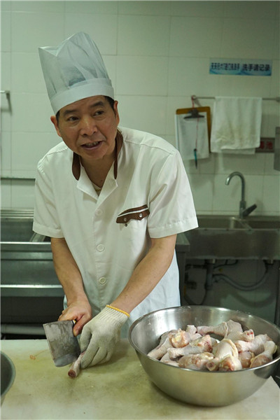 下午3点,午休结束,师傅们又要开始为晚餐供应做准备了。庄佩龙要为明天做的蛋饼调制好面粉,一些点心(如烧卖、南瓜饼等)也要预先做一些放入冰箱备用。此外,每周一次擦拭脱排油烟机、登高擦拭门窗的活他一人也包了。庄佩龙说,食堂5名员工,1人恐高,1人血压高,另2人是女性,所以他就当仁不让了。