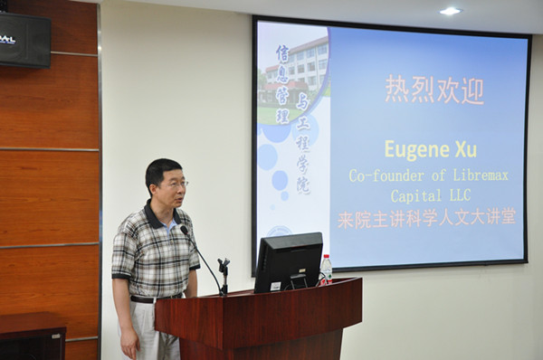讲座伊始,信息管理与工程学院院长岳劲峰教授致欢迎辞,并介绍了嘉宾的相关情况。Eugene Xu先生高中时荣获全国数学竞赛二等奖,并被保送至复旦大学数学系。1992年,他从加利福尼亚大学洛杉矶分校数学博士毕业,先后供职于摩根斯坦利、摩根大通银行等世界知名公司。2000年至2010年任职于德意志银行。期间,正是他的量化模型准确预测了次贷金融危机,帮助德意志银行在次贷危机爆发前做空市场,赢得了丰厚回报,以致在金融界引发轰动。奥斯卡影片《大空头》正是以其为原型拍摄的。