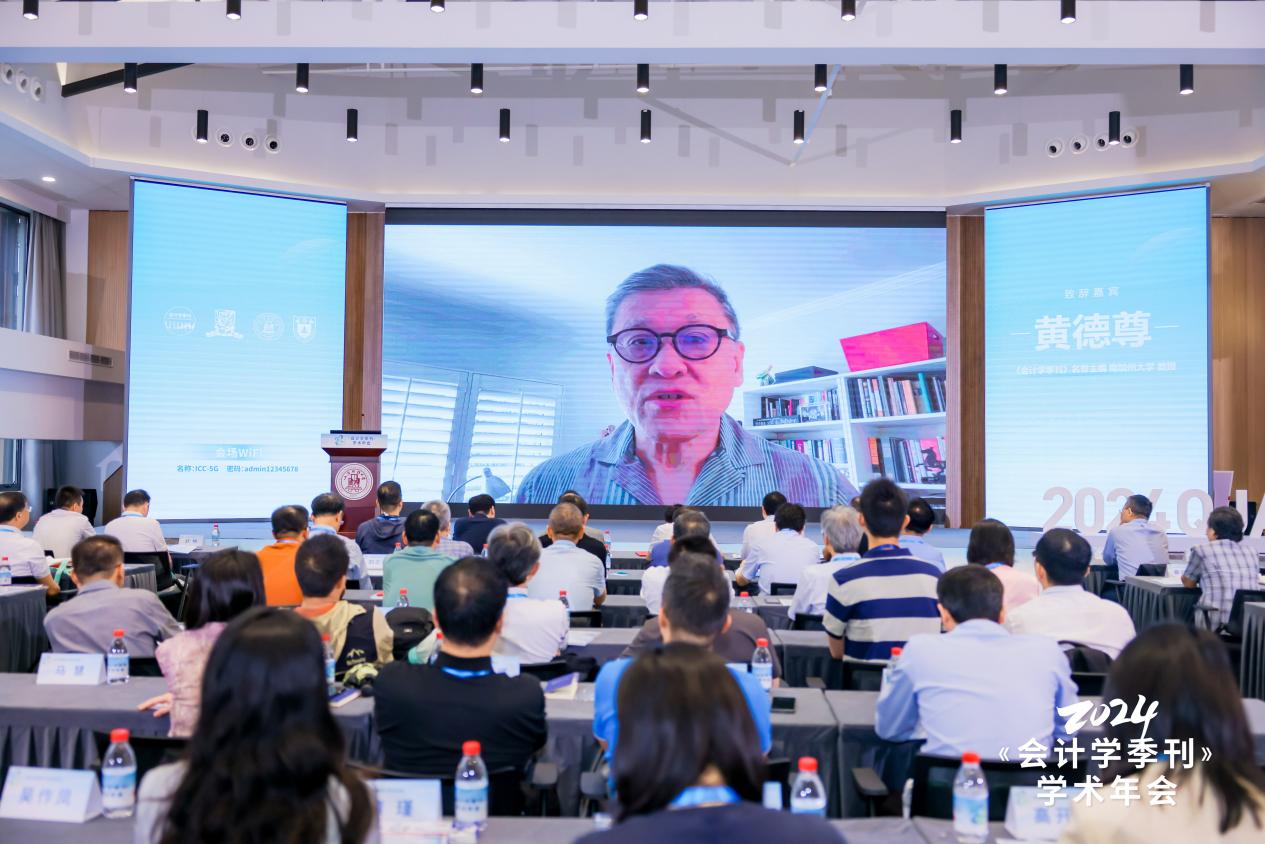 《会计学季刊》名誉主编、南加州大学黄德尊教授在视频致辞中对各位编委创办期刊的不懈努力,首届学术年会主办和承办单位的辛勤付出以及各位同仁对期刊的大力支持表示诚挚感谢。他谈到,《会计学季刊》是许多会计学人共同的心血,承载了众多期待,希望未来期刊扎根中国特色,在挖掘更多有趣的学术问题、加强中国研究的基础理论、提升科学研究的严谨性上下苦功夫、深功夫,成为推动世界了解中国学术研究的一扇窗口,把中国研究推向更高台阶。