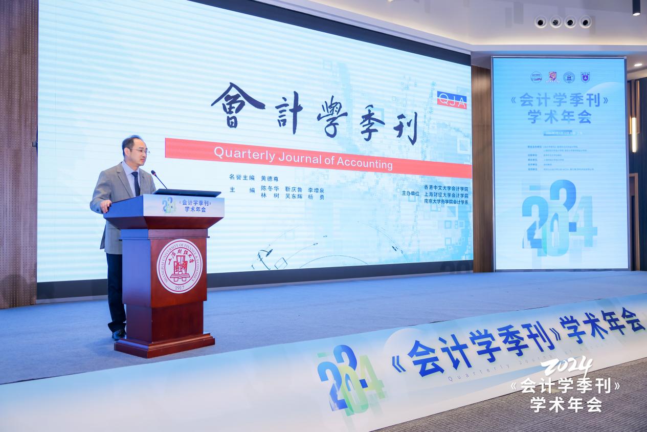 上海财经大学副校长、《会计学季刊》顾问委员陈信元教授致辞。他代表学校对会计学届新老朋友的到来表示热烈欢迎,并对香港中文大学、上海财经大学、南京大学三校联合创立《会计学季刊》表示诚挚祝贺。他表示,期刊的创办站在了中国现代会计研究人才储备和理论沉淀基础的一个新起点上,希望能够形成自己的风格,贯彻落实“百花齐放、百家争鸣”的方针,助力推动中国会计教育事业的蓬勃发展。