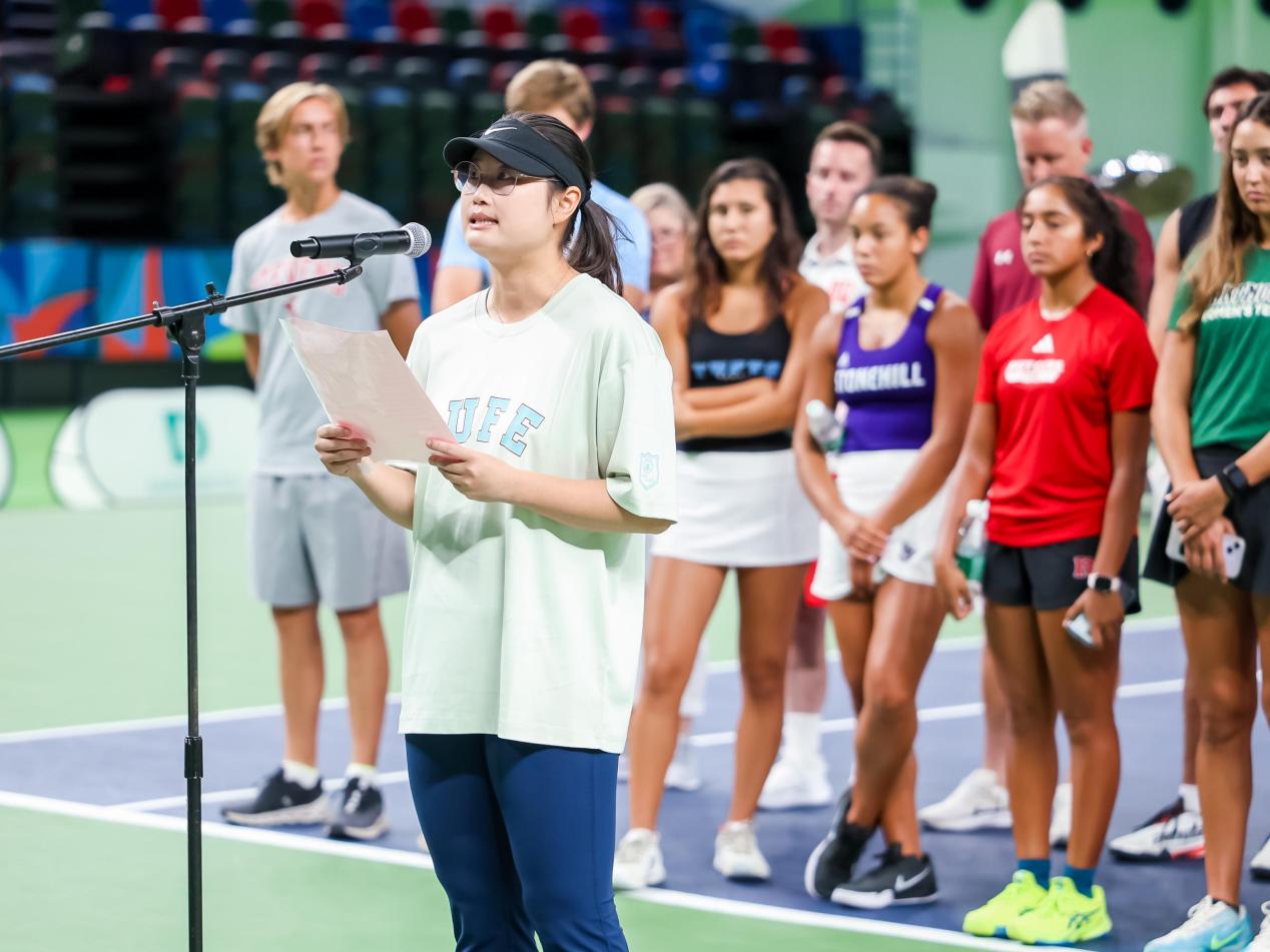 8月17日上午,迎来2024中美大学生网球友谊赛总决赛。女单决赛中,我校张清扬同学在对阵来自罗格斯大学的选手时,比分十分焦灼。在4:4时,张清扬在章凌凌老师的指导下,在多拍相持中寻找机会,逐渐占据上风,最终锁定胜局,以6:4获得女子单打冠军。