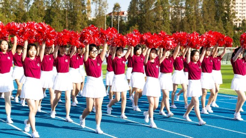 面带阳光般的笑容,花球方队入场。她们尽情舞蹈,拥抱明天;飞扬的秀发,灵动的舞步,标准的动作都洋溢着青春的活力,形成一道靓丽的风景线。