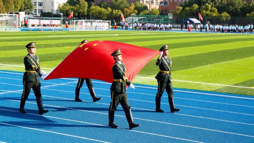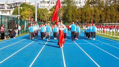伴随着运动员进行曲,国旗班入场。旗手们秉承“心系国旗、服务学校、严于律己、奉献青春”的理念,手持旗杆,以饱满的热情,庄严地护卫着五星红旗。尾随其后的校旗队、红旗队同样也展现出了当代大学生团结进取、积极向上的精神风貌。