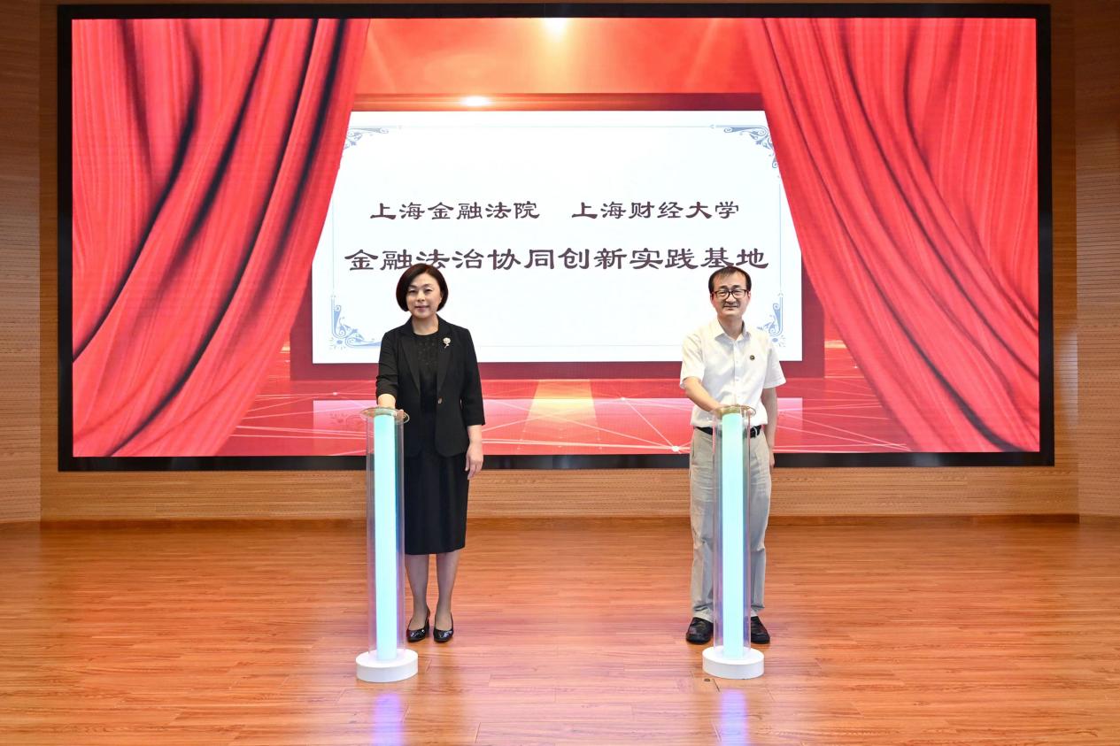 参观完毕后,上海财经大学和上海金融法院举行合作签约暨“金融法治协同创新实践基地”揭牌仪式。仪式由林晓镍副院长主持,刘元春校长和赵红院长一起见证法学院宋晓燕院长与金融法院政治部文勇主任签署《上海财经大学与上海金融法院战略合作协议》,并共同为“金融法治协同创新实践基地”揭牌。刘元春校长在仪式致辞中介绍了上海财经大学的基本情况和最新发展,特别是近期成立滴水湖高金学院、数字经济系,服务上海“五个中心”建设和国家经济发展。对于双方的合作,刘校长谈到应加强党建共建,深入推进习近平法治思想、经济思想的学习宣传贯彻;加强人才培养合作,互相派出业务骨干进行工作交流;加强社会服务合作,双方共建金融法律高端智库,利用上海财经大学的学科特色,为金融司法审判中的投资者损失、证券价格估值等提供专业化的智力支持。赵红院长在致辞中肯定了双方合作的重要意义,并提出三点期望,包括要突出国际化方向,讲好中国故事;发挥双方优势,培养兼具法律和金融知识、理论与实践并重的复合型人才;建立成果转化机制,推出研究成果,树立合作品牌。刘元春校长和赵红院长都衷心祝愿双方的合作能取得圆满成功。