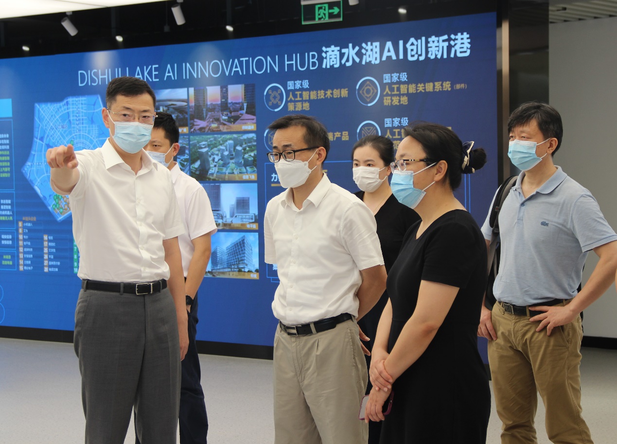 会前,刘元春校长一行还先后来到滴水湖AI创新港、滴水湖一号码头、滴水湖金融湾展厅参观调研,临港新片区党工委委员、管委会专职副主任吴杰及调研点位相关负责同志陪同调研。