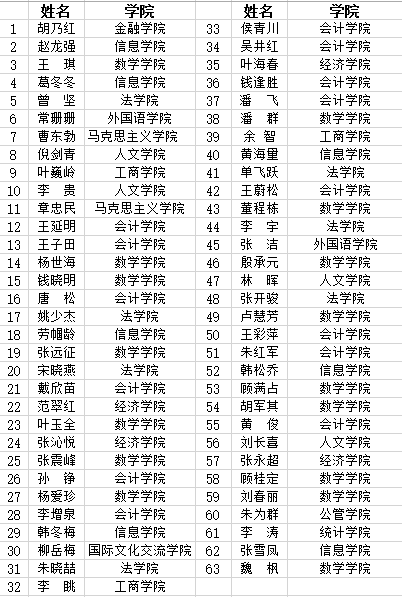 上海财经大学第九届“我心目中的好老师”评选于2016年3月-6月在全校范围开展,经学生提名、多轮投票、学生座谈、评审小组审议等环节,最终评选出63名“我心目的好老师”,现将获选名单公示如下:
